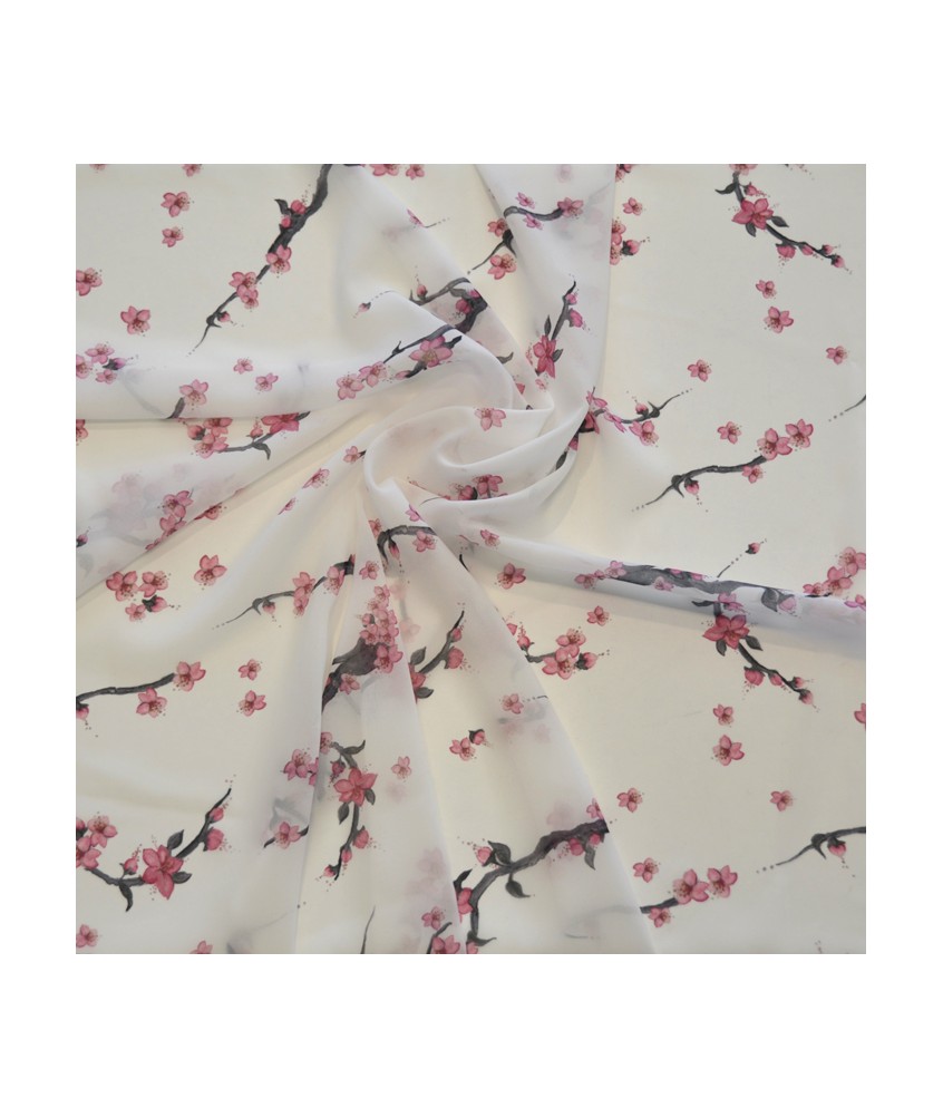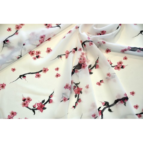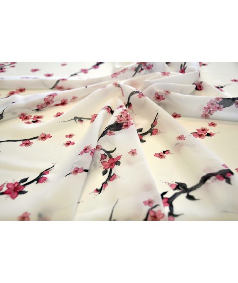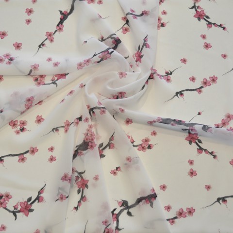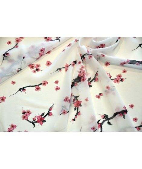 Češnjevi cvetovi privlačijo in očarajo s svojo izjemno lepoto. Spominjajo nas na prihod pomladi, na čas prenove in optimizma. Rožnati češnjevi cvetovi, ki so simbol ljubezni, naklonjenosti in romance so natisnjeni na elegantno prosojno tkanino.