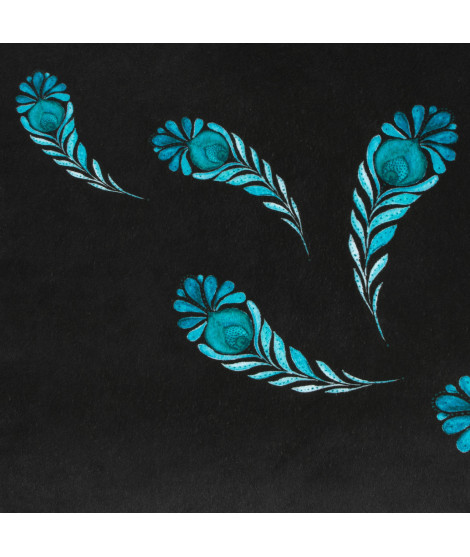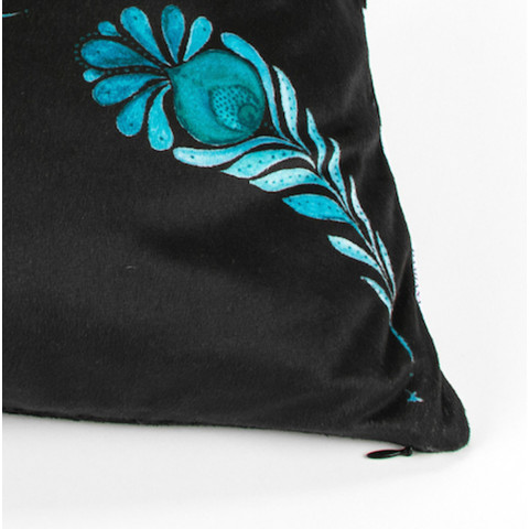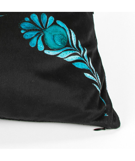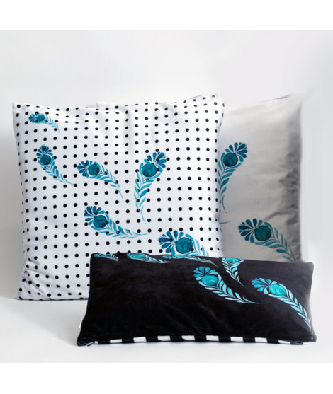Okrasna ročno izdelana blazina z originalnim digitalnim odtisom Smaragdno zelenega Paisley vzorca na mehki žametni črni podlagi, zadnja stran je dopolnjena s črtastim črno-belim grafičnim vzorcem, kar v vaš interier vnaša glamur. Za bolj dovršen interier kombinirajte ostale izdelke iz Paisley kolekcije.