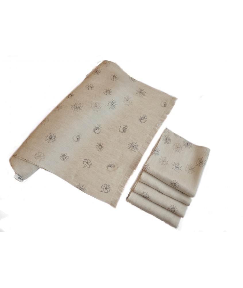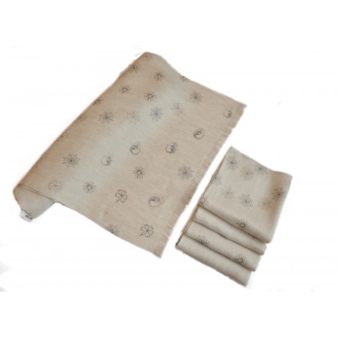 Ročno izdelan 5-delni namizni set. Tekač v kombinaciji s tekstilnimi servietami z avtorskim potiskom na prefinjenem materialu. Oblikovan, da na vašo mizo vnese pridih elegance.